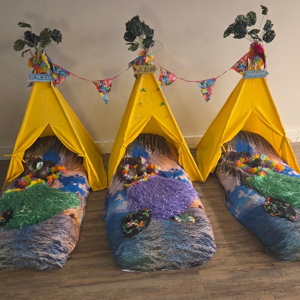De tipi tentjes zijn sfeervol aangekleed in tropische stijl met palmbladeren, bloemenkransen en warme tinten.