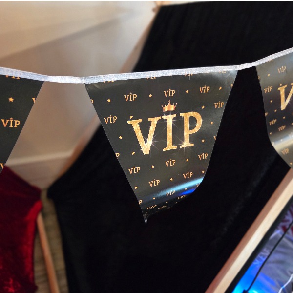 Aankleding met lampjes, vlaggetjes en bioscoop-decoratie