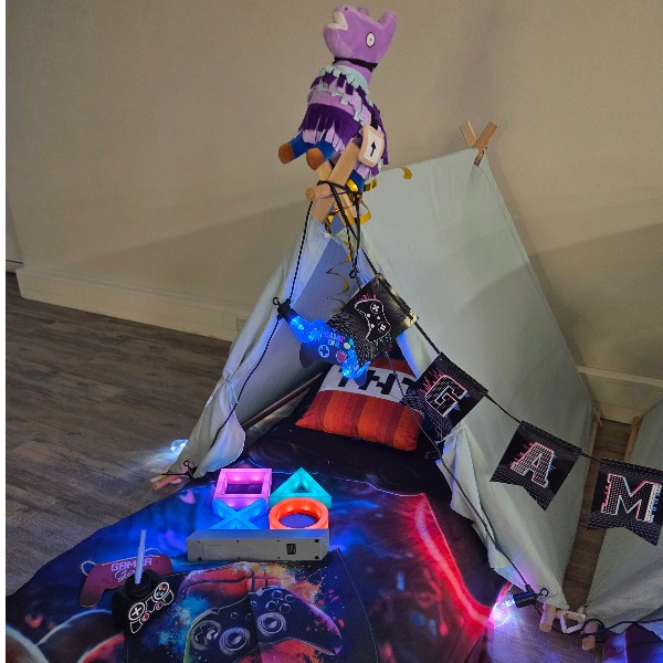 De tipi tentjes zijn ingericht in stoere gamerstijl met donkere tinten, sfeervolle verlichting en game-accenten.