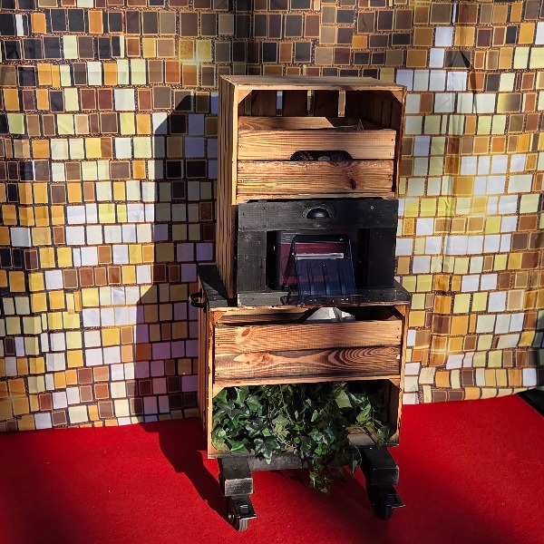 De printer is stijlvol weggewerkt in een decoratieve fruitkist-opstelling, passend bij het ontwerp van de photobooth. Dit zorgt niet alleen voor een nette uitstraling, maar biedt ook ruimte om props, hoedjes en accessoires leuk te presenteren.